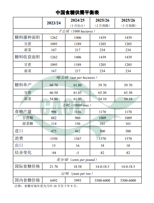 本月對中國食糖供需形勢預(yù)測與上月保持一致。國內(nèi)方面,2025/26年度食糖生產(chǎn)進(jìn)入后半程,北方甜菜糖廠已陸續(xù)結(jié)束生產(chǎn),南方甘蔗糖廠仍處于生產(chǎn)高峰,市場運行總體平穩(wěn),近期受國際市場傳導(dǎo)影響,食糖價格有所回升。國際方面,國際糖業(yè)組織(ISO)將2025/26年度全球食糖過剩量下調(diào)至122萬噸,供給端壓力有所減緩。后期需重點關(guān)注國際原油市場波動、巴西2026/27年度制糖比調(diào)整預(yù)期和印度實際出口對食糖市場運行的影響。
