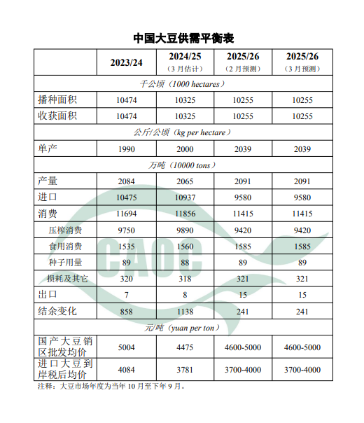 本月對中國大豆供需形勢預(yù)測與上月保持一致。國內(nèi)方面,基層余糧逐漸見底,持糧主體挺價意愿增強,節(jié)后貿(mào)易商補庫需求逐步釋放,大豆消費市場有所回暖,短期看漲預(yù)期較強,但下游對高價原料采購較為謹慎,價格持續(xù)上行空間有限。國際方面,巴西大豆正處收獲高峰期,產(chǎn)量預(yù)期繼續(xù)上調(diào),有望再創(chuàng)新高。