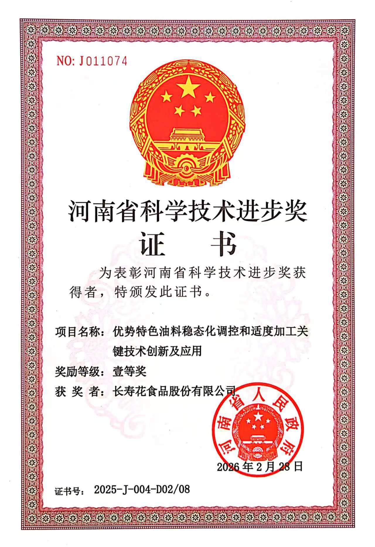 近日,2025年度河南省科學技術(shù)獎勵評審結(jié)果正式揭曉,長壽花食品股份有限公司聯(lián)合河南工業(yè)大學共同完成的《優(yōu)勢特色油料穩(wěn)態(tài)化調(diào)控和適度加工關(guān)鍵技術(shù)創(chuàng)新及應用》項目,成功斬獲河南省科技進步一等獎。