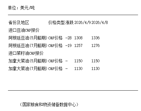 4月9日進口阿根廷豆油及加拿大菜籽油C&F報價