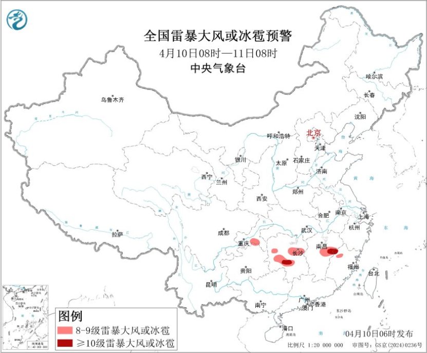 中央氣象臺4月10日06時繼續(xù)發(fā)布暴雨藍(lán)色預(yù)警和強(qiáng)對流天氣藍(lán)色預(yù)警。預(yù)計,4月10日08時至11日08時,湖北南部、湖南中北部、江西中北部、福建西北部、重慶中部、貴州東北部、四川中部等地部分地區(qū)有大到暴雨,其中,湖南中部等地部分地區(qū)有大暴雨(100~110毫米)(見圖1)。江南中部等地的部分地區(qū)將有8級以上雷暴大風(fēng)或冰雹天氣,其中,湖南中南部、江西中東部、福建西北部等地的部分地區(qū)將有10級以上雷暴大風(fēng),最大風(fēng)力可達(dá)11級以上;江南中部、西南地區(qū)東北部等地的部分地區(qū)將有小時雨量大于20毫米的短時強(qiáng)降水天氣,其中,湖南中部的部分地區(qū)小時雨量大于50毫米(見圖2)。