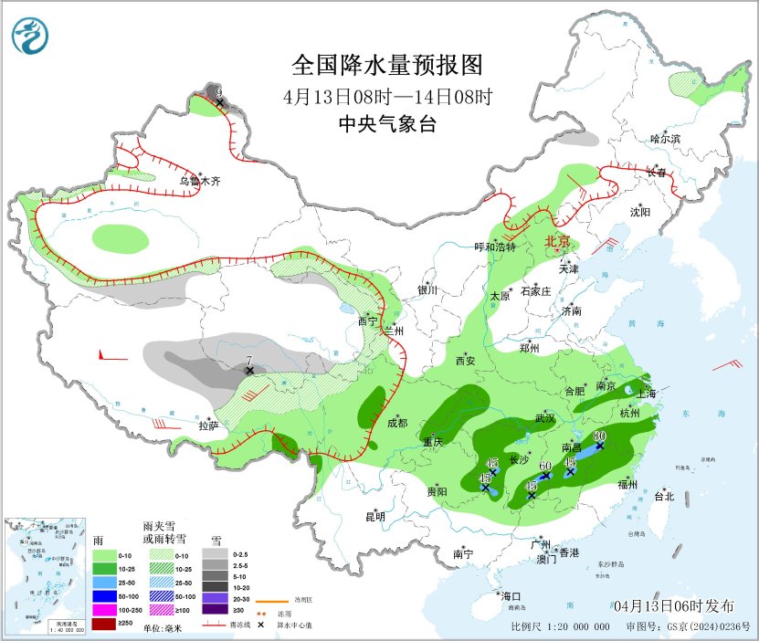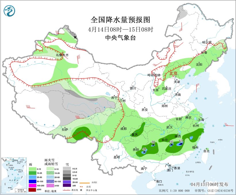 4月13日08時(shí)至14日08時(shí),新疆阿勒泰北部和南疆盆地、西藏北部、青海東部和南部、甘肅河西和南部、川西高原北部以及內(nèi)蒙古中部、黑龍江北部等地部分地區(qū)有小雪或雨夾雪,其中,新疆阿勒泰北部、西藏北部、青海西南部等地部分地區(qū)有中到大雪(5~9毫米);西藏東南部、四川盆地西部、西南地區(qū)東北部、江南大部、湖北南部、廣西北部等地部分地區(qū)有中到大雨,其中,湖南東南部、江西東北部等地局地有暴雨(50~80毫米)。內(nèi)蒙古中部有4~6級(jí)風(fēng),西藏部分地區(qū)有7~8級(jí)風(fēng)(見圖2)。