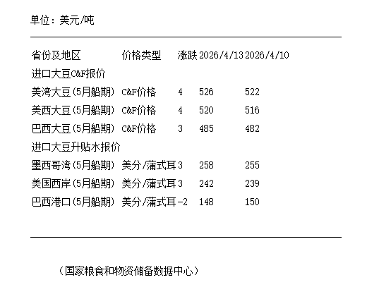 4月13日進口大豆到國內(nèi)港口C&F及升貼水報價