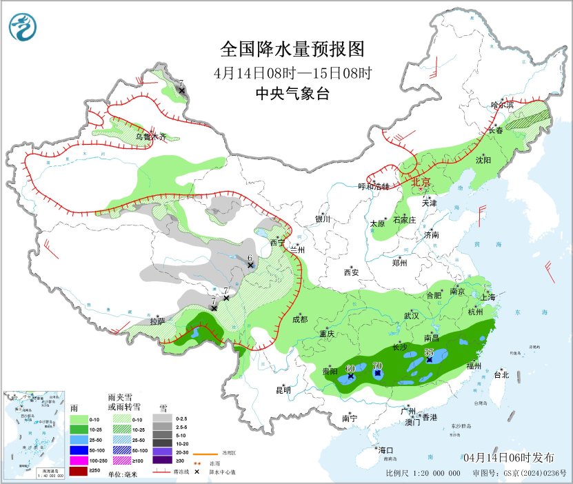 4月14日08時(shí)至15日08時(shí),新疆北疆東部和南疆盆地、西藏東南部、青海大部、甘肅河西和南部、川西高原北部、黑龍江東南部、吉林東部等地部分地區(qū)有小到中雪或雨夾雪,其中,新疆北疆東部、西藏東北部、青海東南部等地部分地區(qū)有大雪(5~7毫米);江南中南部、貴州東南部、廣西東北部、廣東西北部、西藏東南部等地部分地區(qū)有中到大雨,其中,貴州東南部、湖南南部、江西中部、廣西東北部等地局地有暴雨(50~70毫米)。內(nèi)蒙古中東部、新疆北疆北部和沿天山地區(qū)、西藏南部和西部、山東半島等地部分地區(qū)有4~6級(jí)風(fēng);北部灣有5~6級(jí)風(fēng)、陣風(fēng)7級(jí)(見圖1)。